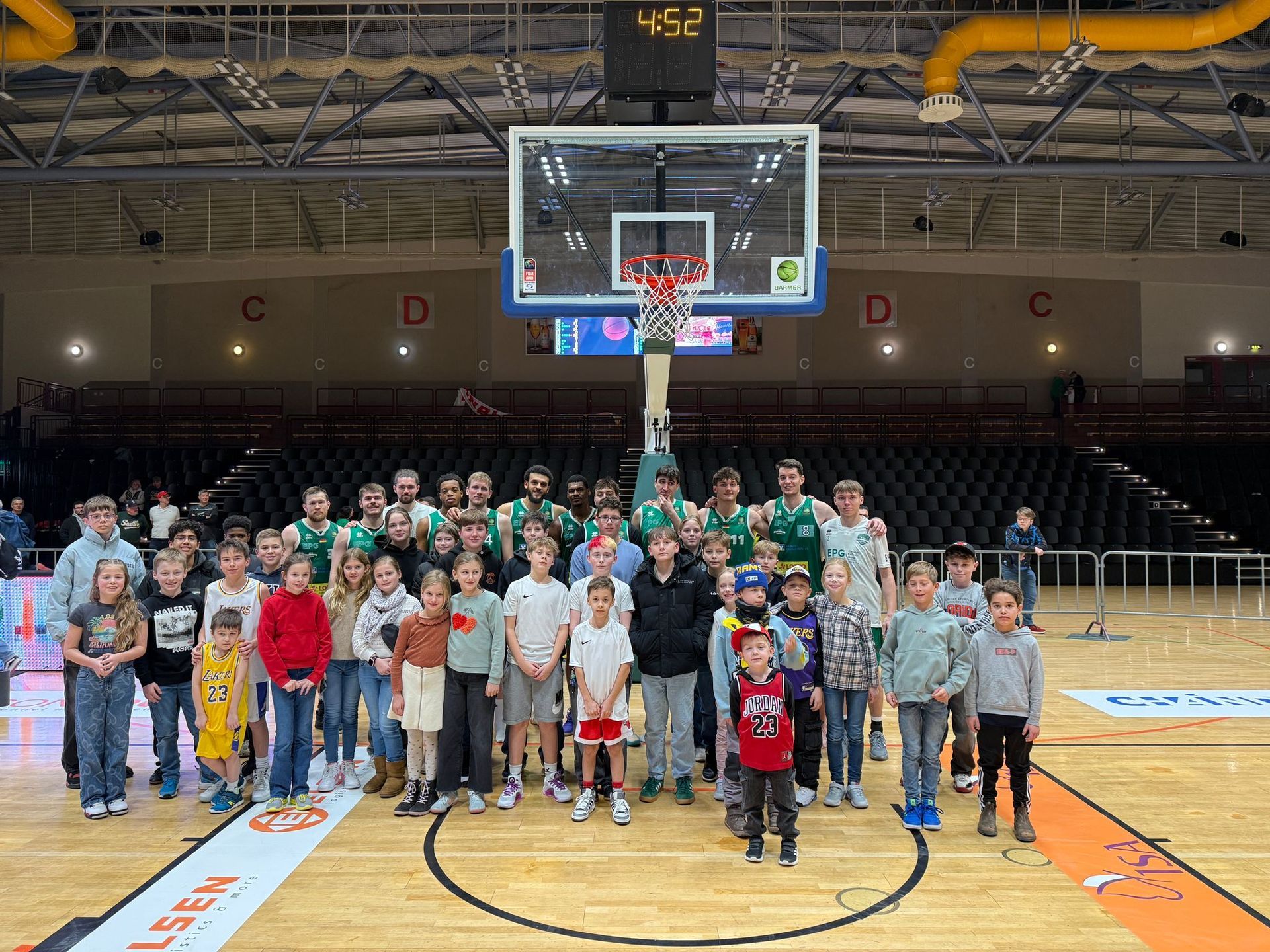 Umso aufgeregter waren einige Kinder, als sie als Einlaufkinder an den Händen der Profis die Halle vor Beginn des Spiels zum kochen bringen durften. Unter Applaus aller Zuschauer wurde mit den Trainern der EPG Guardians abgeklatscht und gemeinsam unter dem Korb auf alle Spieler der Guardians gewartet.