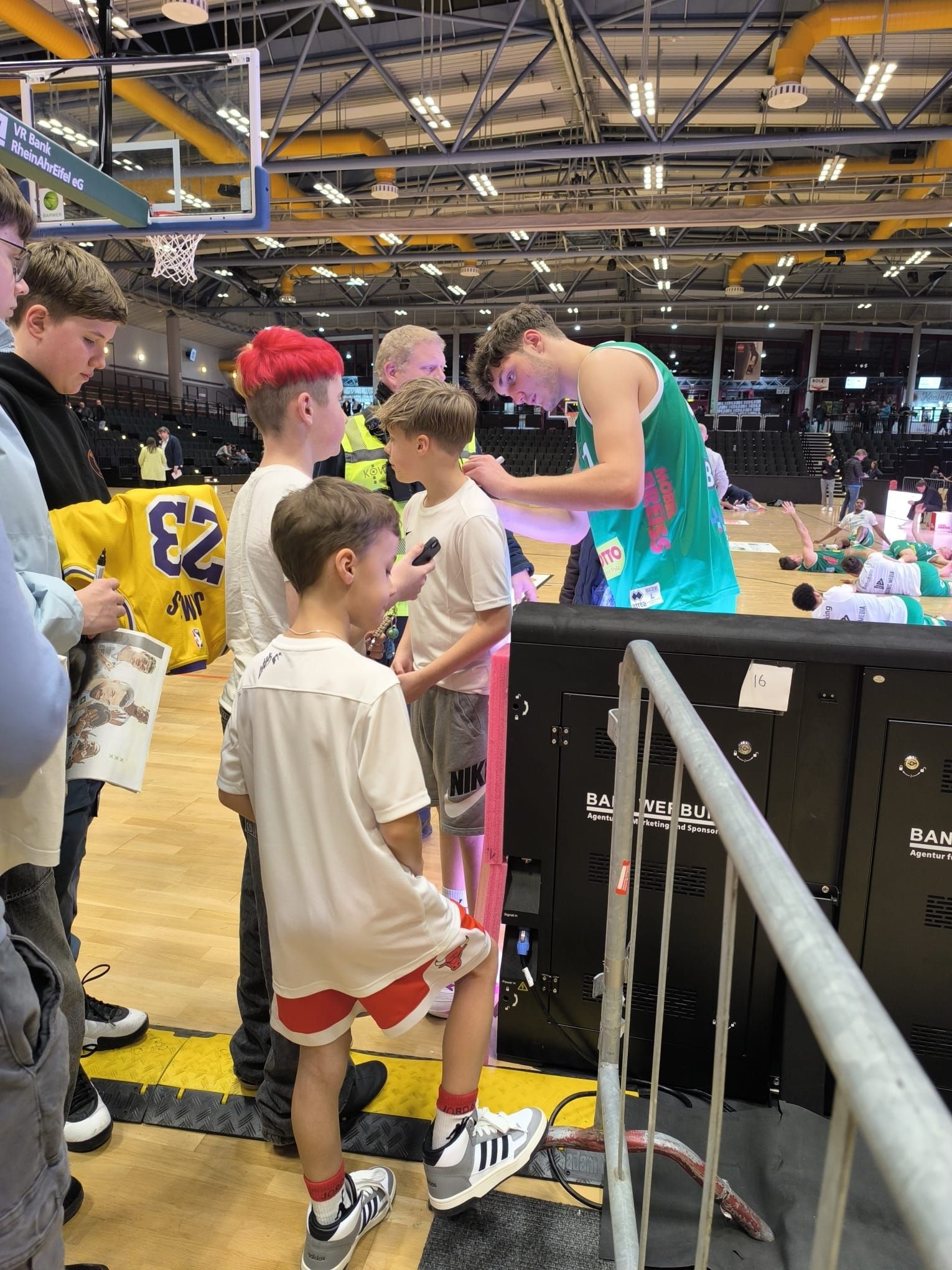 Nach Ende des Spiels nahmen sich die Profis noch ein paar Minuten exklusiv für die Kids des TUS Mayen BB Zeit, schrieben Autogramme, standen für Fotos zur Verfügung und ein gemeinsames Abschlussfoto unter dem Korb wurde geschossen.